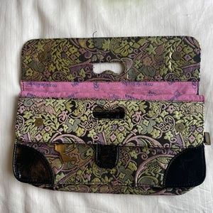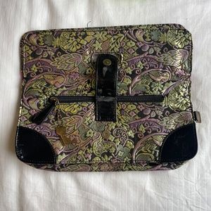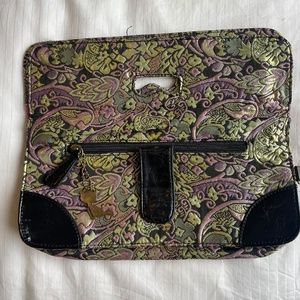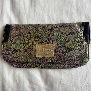 Faux leather black edge, metallic fabric, magnetic closure, 1 zipper inner pocket, 1 slot pocket, 11.5in (L) x 5.5in (H) x 2in (W)