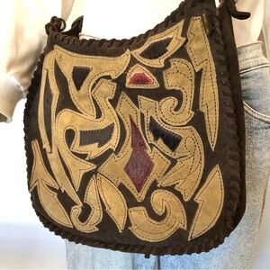 Lollipops Genuine Leather Suede Boho Pattern Neutral Tone Brown Roomy Shoulder Bag Crossbody Bag.