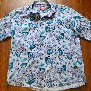 Gently pre-owned with light wear. A few small coffee stains noted on the cuffs and one faint mark near the third button down — shown in photos. No holes or tears. Still a stylish, high-quality shirt with lots of life left.