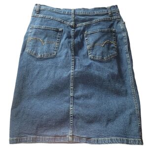 Stylish and comfortable women's blue denim skirt with distressed markings on front. Perfect for casual outings. Durable fabric with a classic look. Has a 5 pocket design and a front split seam. Button and zipper front closure.