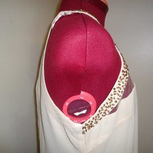 Ladies size 6 sequined A-line cream cocktail/prom mini length dress. Chiffon overlay in cream with sequin embellishment on neckline. 100% polyester lining and overlay.