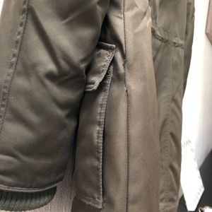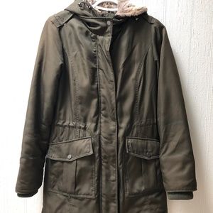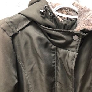 Lovely olive/army green jacket with faux fur lined hood by London Fog. Size XS. Has two small tears on the seams on either side that have been repaired. See the photos for more details. The price has been adjusted to reflect this.