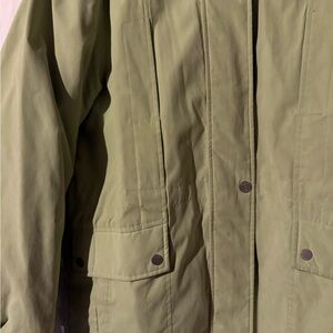 Green ski jacket. Features front pockets and snap closure. Ideal for winter activities.