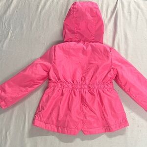 Charming pink raincoat by London Fog. Features a cozy hood and fun design. Perfect for rainy days.