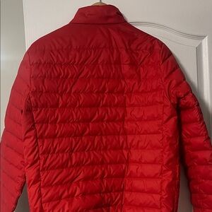 Stylish red puffer jacket. Lightweight and warm. Perfect for cold weather.