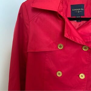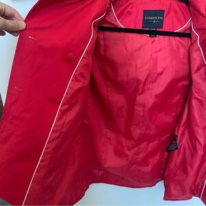 Stylish double-breasted short trench coat from London Fog. Bold red colour with gold buttons. Perfect for any occasion. Detachable hood. Gold adjustable buckle accents on cuffs. Colour on this jacket is incredible ❤️ Amazing coat for an elevated and classy look.