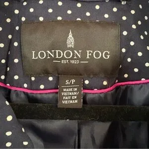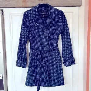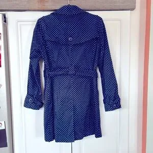 This adorable coat is navy with white polka dots. Buttons up and has an optional waist belt.
