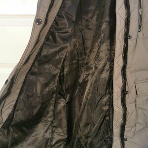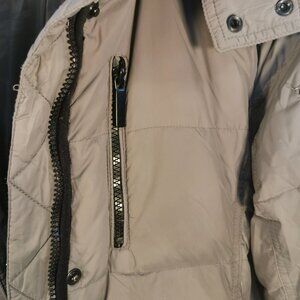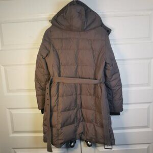 Winter is coming! Stay warm and stylish with this very good condition used, belted quilted down coat, perfect for cold winter days and outdoor activities. This women's puffer jacket is designed for the fashion-forward woman who values both style and comfort. Zippered and snap closures.