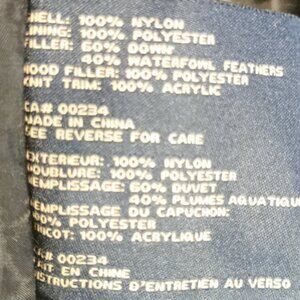 Made from - Shell:100% Nylon, Lining:100% Polyester, Filler: 60% Down, 40% Waterfowl Feathers, Hood Filler: 100% Polyester, Knit Trim: 100% Acrylic
