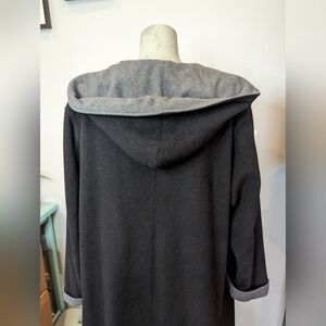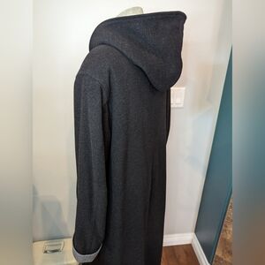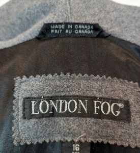 London Fog Wool Hooded trench coat Plus size 16. Black charcoal with gray undertones and a dark gray hood. Fits true to size.