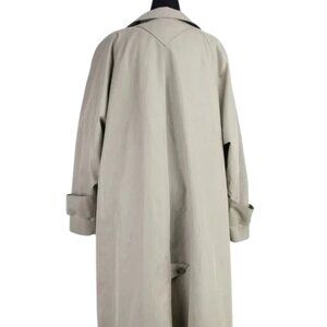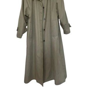 A classic-style, single-breasted London Fog trench coat in a neutral taupe color. The coat is long, extending well past the hips, and features a standard collar, a full button-front closure, and two large pockets at the hips. The sleeves have buttoned cuff straps. This type of coat is a versatile outerwear piece suitable for a range of occasions and can often be worn year-round.