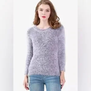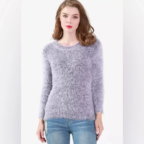 Cozy and stylish fuzzy sweater in a soft gray color. Perfect for a chic and comfortable look.