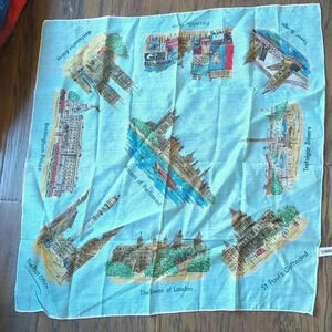 This Tourist Souvenir scarf is from my Mother's closet. She was in London in 1980. Scarf shows pictures of the main Architectural buildings of the time such as The Tower Bridge, Buckingham Palace, Parliament, etc.