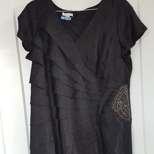 Worn once then dry cleaned, like new London Times cocktail length dress. Very flattering shimmery shutter style. Decorative beaded patch on the side. Purchased on Amazon for $160. For more details, here is the Amazon link to the dress in another color: https://www.amazon.com/London-Times-Womens-Shutter-Tuck-Beaded/dp/B00OW37OAK?SubscriptionId=AKIAJTAQJFXQ45MML2MA&tag=bogomash-20&linkCode=xm2&camp=2025&creative=165953&creativeASIN=B00OW37OAK
