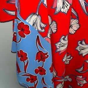 This dress brings up feelings of the perfect spring or summer day with its bright red floral pattern. Features: spaghetti straps with a cold shoulder flounce; red base with an allover blue, pink and white floral pattern; contrasting hem pattern; concealed back zipper; fit and flare/A-line cut; lined bodice.