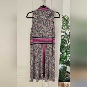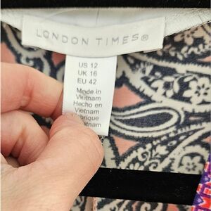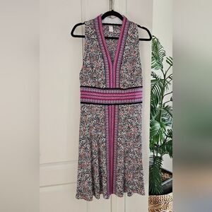 This chic sundress by London Times features a sleeveless design with a flattering V-neckline, perfect for casual or work settings. The black and white , pink print adds a classic touch, while the midi length and A-line silhouette offer a comfortable and stylish fit.
