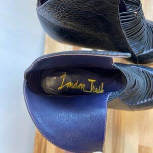 London Trash Black Crocodile Textured Stiletto Heels With Unique elastic Lace-Up Design & High Platform in size 8 with purple reverse