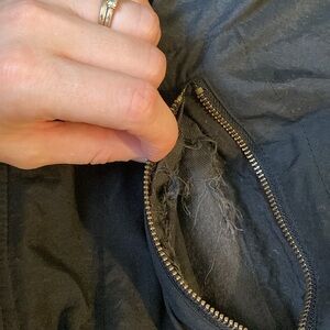 London fog black removable liner hooded coat. The hood does remove. Wash the coat without the hood on. The outside material does collect all dust and fur from the hood. Synch-able waist and bottom of the coat. The one pocket on the chest is ripped inside. All other pockets are good. Made by FREED & FREED INTERNATIONAL LTD in Winnipeg. Made in I believe 1996.