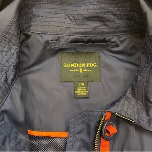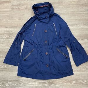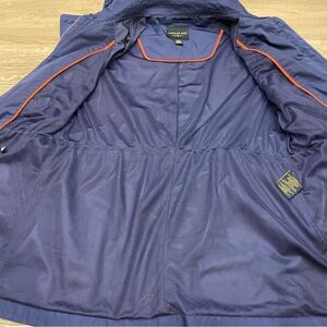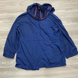 Single breasted button front balmacaan with raglan sleeve and button down double collar. Hooded. Contrasting orange stitching.
