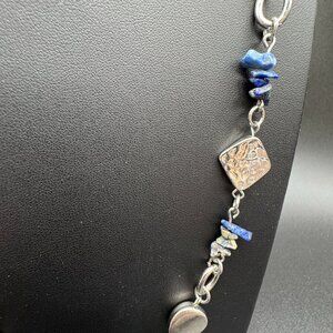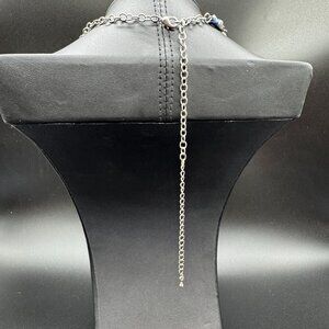 Long Beaded Necklace Silver Tone and Blue Chip Stones