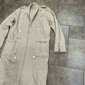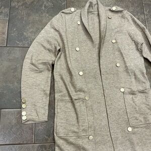 NWOT Stylish long khaki beige cardigan winter outerwear. Features gold buttons and front pockets. Has a slight tan color to it, compared to picture from lighting.