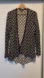 Long 60% cotton cardigan, featuring a sophisticated black and cream pattern and purple accents. Perfect for layering and adding a touch of class to winter outfits.