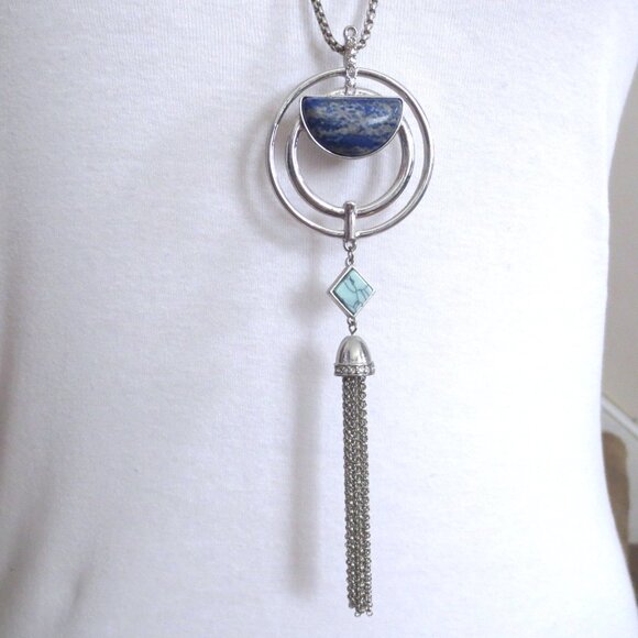Long Bohemian Artistic SIlver and Blue Long Tassel Necklace with Blue Stones