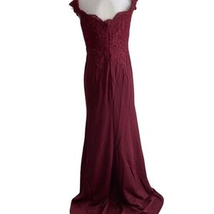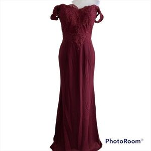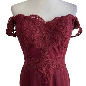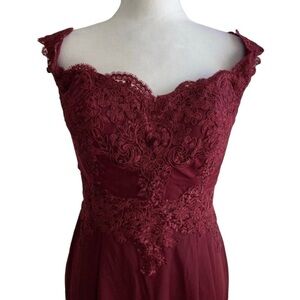 Beautiful burgundy long lace formal party dress with off the shoulder cap sleeve. Lace around full bodice. Invisible zipper on back. Perfect for any special occasion or formal event including wedding, prom, bridesmaid, graduation, gala, engagement, cocktail, destination or garden wedding. Measurements are approximate: SIZE XS Bust 33" Waist 25" Hips 34" SIZE L Bust 40" Waist 32" Hips 41"