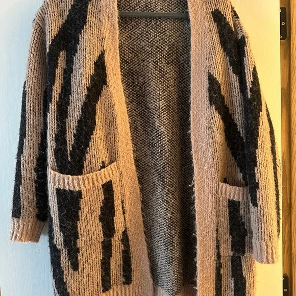 Stay warm and stylish with this cozy open-front sweater. Featuring a chic black and tan design, it's perfect for layering. Ideal for any casual outing. Only worn a couple times, practically new.