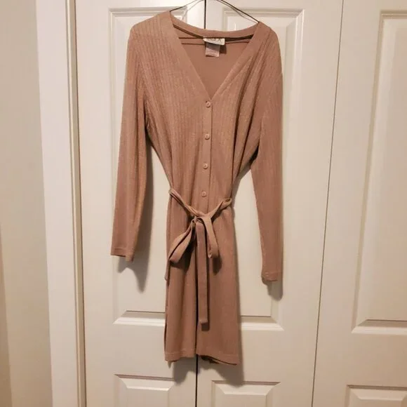 Polyester/Cotton Thin Never worn Use as sweater dress with pants/tights as its open after the buttons