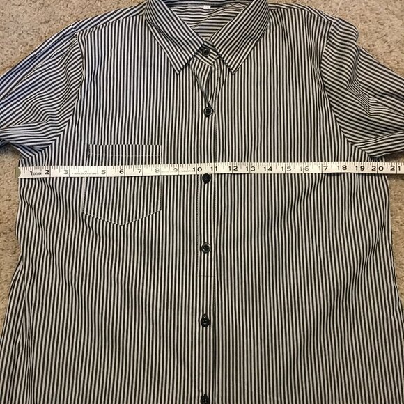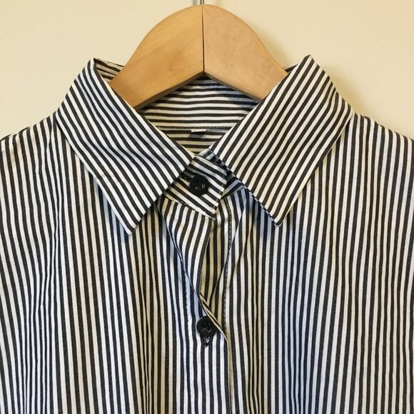 Very good preowned condition, white and black/dark charcoal grey, vertical stripe, button down dress shirt. This shirt is very long with a droptail hem. Laid flat, the hem seem to line up, but on a hanger, the back hangs a bit lower. (The front be more of a 29.5" long while the back is 32" because of this. But please see photos for precise measurements. A cute simple, basic and essential shirt.