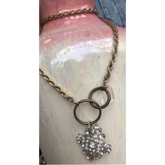 Long gold rope chain with chunky rhinestone pendant. Can be worn long or wrapped a second time around the neck for an edgy layered look.