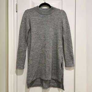 Long grey mock neck sweater with open slit around hip. Slightly longer in the back than the front. Brand & size unknown, tag was removed, but fits like an XS.