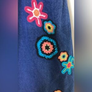 Long denim skirt with cotton embroidered details. Front zipper, 2 front pockets and key pocket, 2 back pockets, and back split. Lg