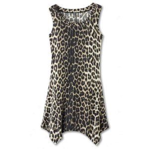 This fun leopard-print top tapers at the waist and features a flared handkerchief hemline.