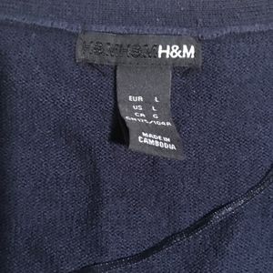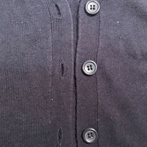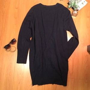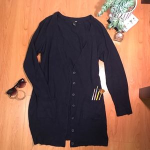 This long navy blue button-up Corrigan sweater with pockets is ideal for layering! It almost looks black, but up close you can see it is a very dark blue.