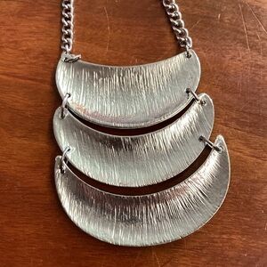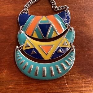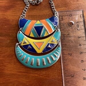 Long Necklace with a three-piece hinged enamel pendant. Gorgeous colour mix of coral blue turquoise and yellow set with a silver tone