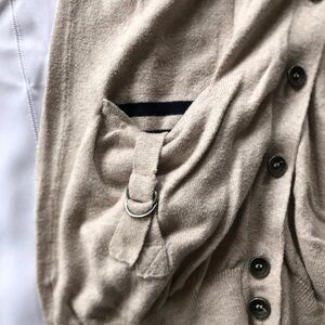 Oatmeal coloured and navy accents with a little belt loop detail on the pockets. Longer length makes it perfect for covering one’s bottom (should you be self conscious like me. Haha). Original owner but this cardigan has been worn more than a few times- often a go to when I was wearing a navy dress or pants. Size small but fits like a medium. Long ago cut off the material content tag.