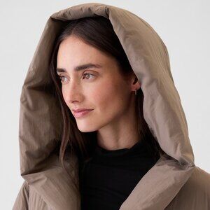 New with tags! Soft brown colour. A mega-warm layer with the cozy factor turned all the way up. Puffer coat with quilted water resistant outer shell and warm-as-down insulation. Hooded neckline. Long sleeves with cozy knit cuffs and thumbholes. Snap-button closure. Side slant pockets with warm fleece interior. Made with 100% PrimaLoft® P.U.R.E.™ recycled polyester fill.