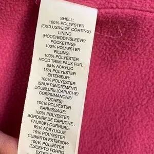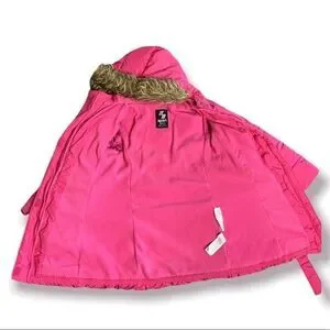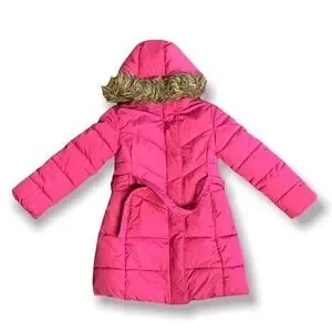 Another jacket in pink. This one is longer for extra style and warmth. Very good condition with minor signs of wear. Size XS = 4 kids. Faux fur trim.