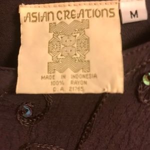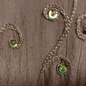 Very unique long dress, rich purple colour with green shimmery sequins sewn all over the front in a textured pattern. It reminds me of a peacock, not sure why :) Gorgeous piece! Lined front, very cool and comfortable.