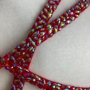 Gorgeous open back dress adorned with irridescent rhinestones and a flowy skirt. Super lightweight fabric. Pleated criss cross bodice. Cut out sides. Invisible zipper on back of skirt.