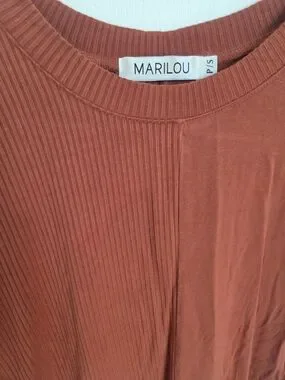 Long rust short sleeve top with a subtle rib texture. Soft, breathable fabric for everyday comfort. Easy-to-style silhouette that pairs well with legging or as a dress..