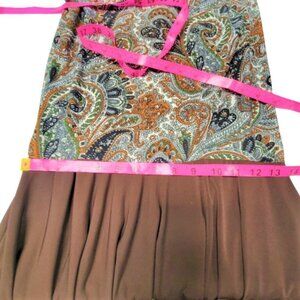 Multicolored Paisley print in browns on the top sectional with a solid dark brown at the bottom flared part of Skirt