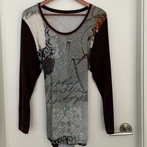 Long Sleeve Abstract Comfy Tunic Round Neck Brown Blue XXL