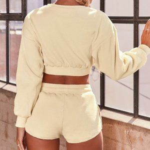Made with ribbed fabric, long sleeve crop top with a crew neck and shorts with draw strings. Moisture wicking extra stretchy soft fabric.