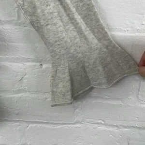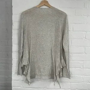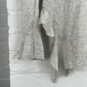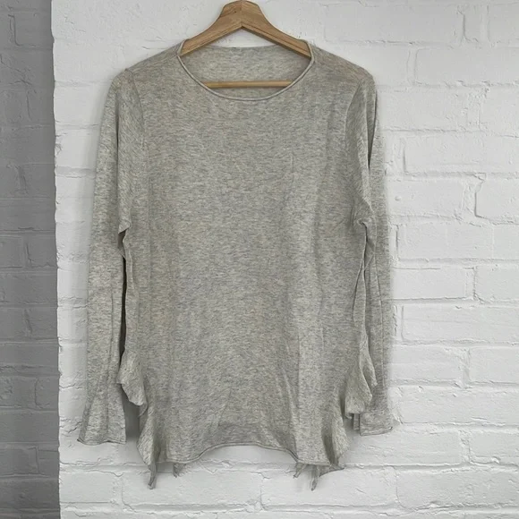 No brand. Long sleeve heather grey shirt. Soft and lightweight. Ruffled at the bottom on the sides and slightly ruffled sleeves. Pit to pit 21”. Length 27”.