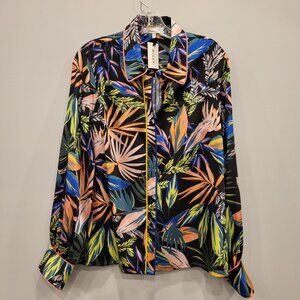 Long Sleeve Tropical Floral Office Button Down Blouse Large