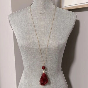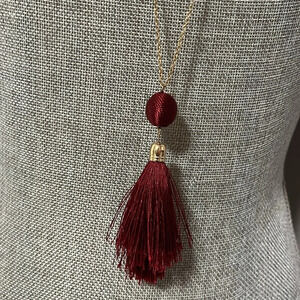 Burgundy double tiered tassel hangs from a woven ball and gold accents. Chain is 17.5” with extender. Tassel piece measures at 3.5” including the ball. It’s simple and elegant. Excellent condition like new.