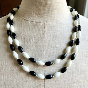 Long Vintage Art Deco Black & White Czech Glass Oval Bead Rope length Necklace.